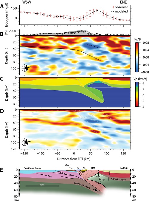 (2)发现深部存在具有较厚的缝合带,那里地震波速度倒转,低密度的俯冲陆壳带被高密度的地幔物质压覆,指示欧洲下地壳俯冲到亚得里亚地幔之下。