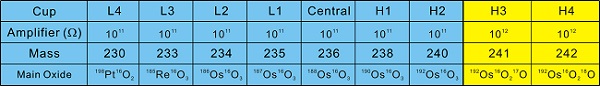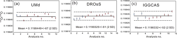 锇同位素在大陆岩石圈地幔定年、壳幔物质来源示踪、金属矿床定年、天体化学、环境演化以及核幔相互作用等领域中具有重要应用价值。锇同位素分析最关键的技术进展是负离子热电离质谱(NTIMS)锇同位素测定方法的建立。由于NTIMS法测定的是OsO3-负离子,故需将OsO3-负离子的测定结果通过氧校正计算(剥氧)换算为Os同位素比值结果。传统的氧校正方法是采用文献报道的氧同位素比值(如Nier值)或实验室长期测定的氧同位素平均值进行氧校正计算。然而由于同位素分馏效应的存在,自然界氧同位素比值存在一定的变化范围,而实验室氧同位素测定值也可能随实验条件(比如灯丝温度、发射剂配比及加载方式、离子源氧压等因素)变化,甚至NTIMS测试过程中氧同位素都可能存在复杂的分馏效应(即氧同位素组成可能随着测试的进行而发生变化),因此传统方法采用固定的氧同位素比值进行锇同位素分析结果的氧校正计算,可能影响最终Os同位素测定结果的准确度。
