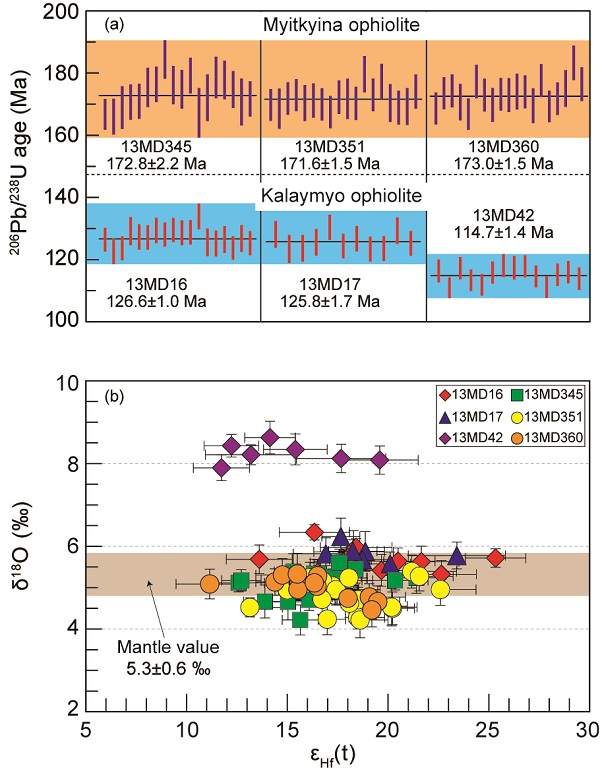 为正确厘清缅甸不同蛇绿岩带之间的关系及其与青藏高原蛇绿岩带的连接,我室刘传周研究员及其合作者对雅鲁藏布江蛇绿岩和缅甸蛇绿岩开展了系统的年代学研究。首先通过对罗布莎蛇绿岩中的辉长岩与角闪岩进行年代学研究,重新厘定了该蛇绿岩形成于早白垩世(~ 130 Ma)而非中侏罗世(Zhang et al., Lithos, 2016, 245: 93-108)。其次,对缅甸境内吉灵庙蛇绿岩采集的异剥钙榴岩和斜长角闪岩、密支那蛇绿岩采集的斜长花岗岩样品进行了系统的岩石学与地球化学分析,在此基础上开展了锆石SIMS U-Pb定年及Hf-O同位素研究(图2)。结果表明,缅甸东段的密支那蛇绿岩形成于中侏罗世(~171-173 Ma),而西段的吉灵庙蛇绿岩形成于早白垩世(大约125 Ma)。总结前人已经发表的班公湖-怒江蛇绿岩带与雅鲁藏布江蛇绿岩的年代学资料,揭示出缅甸东段的密支那蛇绿岩与班公湖-怒江带形成时代吻合,而西段的吉灵庙蛇绿岩则与雅鲁藏布江带具有一致的年龄(图3)。因此,他们提出缅甸东、西蛇绿岩带隶属于两条时代不同的缝合带,分别代表了班公湖-怒江带和雅鲁藏布江带的东延。