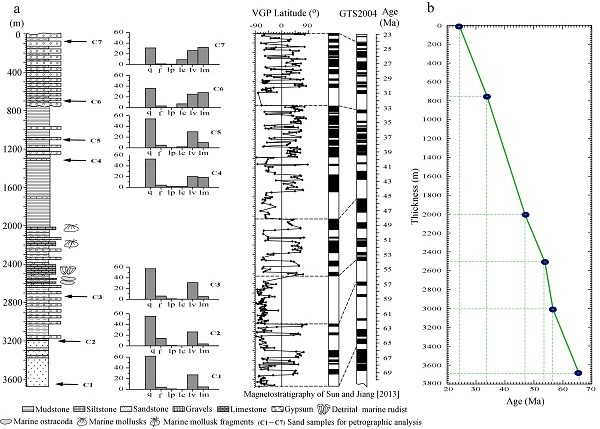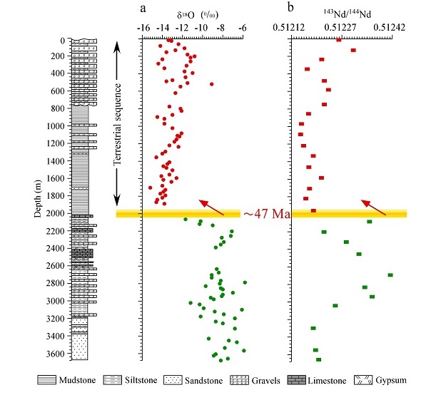 我室孙继敏研究员与其合作者,对帕米尔东北缘前陆盆地奥依塔克剖面(图1),开展了砂岩成分、碎屑锆石的U-Pb年龄与Hf同位素、磁组构、稳定同位素物源示踪等综合研究。该剖面的下部夹有始新世的海相地层,他们此前在古生物化石基础上,结合磁性地层学序列,建立了该剖面~65-24 Ma以来的时间标尺(图2)。结合物源分析,他们提出帕米尔东北缘前陆盆地奥依塔克剖面47Ma以来物源发生重要改变,而这一改变与印度板块与亚洲南缘的科希斯坦-拉达克弧 (Kohistan-Ladakh) 的碰撞导致的造山带隆升与物质剥蚀有关。研究显示,碎屑锆石的U-Pb年龄谱在47Ma之后样品中新增了100-40Ma年轻的锆石组分,其侵入岩主要见于科希斯坦-拉达克弧 (Kohistan-Ladakh)以及毗邻的喀喇昆仑和南帕米尔地块,结合锆石的Hf同位素结果,他们认为在 47Ma以后,奥依塔克剖面新增了来自科希斯坦-拉达克弧以及喀喇昆仑的物源,排除了南帕米尔来源的可能性。此外,磁组构的结果表明磁化率与磁组构参数均在47Ma之后整体上显著增大,磁化率与磁组构参数之间的同步变化表明磁组构主要为沉积成因,二者在47Ma后的增强主要是新加入了磁性更强的来源物质,这与科希斯坦-拉达克弧以及喀喇昆仑地块100-40Ma期间大量的强磁性I-型花岗岩的后期剥蚀风化有关。碳酸盐组分的氧同位素以及全岩样品的Nd同位素曲线同样反映了47Ma之后的物源改变(图3)。