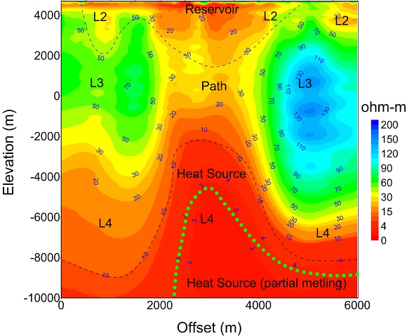 上地壳熔融是地球动力学和能源科学关注的一个热点。由于缺乏直接证据,关于上地壳熔融一直存在较大争议。西藏南部是我国高温地热显示出露最为广泛的地区,发育了水热爆炸、高温间歇泉、沸泉等高温地热显示,是我国地热开发最具前景的地区之一。然而,西藏南部尚未发现近代火山喷发记录,因而西藏南部地热系统的热源问题一直是地热研究的热点。先期深部地球物理探测数据表明,西藏南部25~40 km埋深范围内存在一个范围较大的熔融层,但模拟结果表明这套熔融层难以充当热水系统的“热机”。水文地球化学和地热研究推测西藏南部深层岩浆沿断裂上升侵位到上地壳浅部形成单个的岩浆房, 为热水系统提供热源,但缺乏地球物理证据。