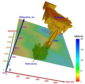 我室何兰芳博士后、陈凌研究员和西藏自治区国土资源厅多吉院士及其合作者利用高密度大地电磁(MT)和音频大地电磁(AMT)测深数据描述了西藏南部神湖的一个地热田。典型电阻率剖面(图1)和三维电阻率等值面成像结果(图2)表明:该地热田的深部7 km 以下发育了电阻率1~15欧姆米、往深部分布范围逐步变大的低阻(高导)异常体。对比研究发现该地区有着与美国Oregon 地区Newberry 火山类似的电性结构,且具有更低的深层电阻率。他们综合该地区的地质、水文、地球化学和地球物理资料,认为上述低阻异常反映该地热田7 km以下地壳中的部分融溶体,为藏南上地壳熔融提供了新的地球物理证据。