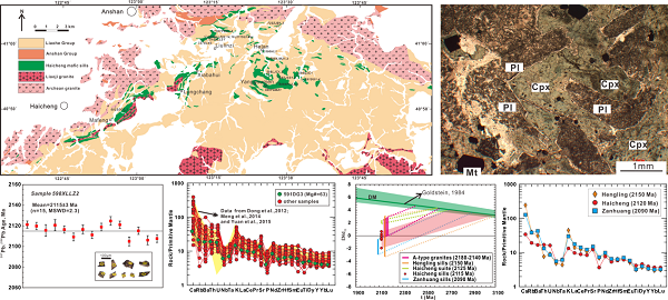 我室博士研究生王欣平在其导师彭澎研究员的指导下,对海城地区出露的基性岩床进行了系统的野外地质考察,岩相学观察,地球化学和地质年代学工作(图1),并取得了以下进展:1. 通过详细的野外工作,确定这一地区相关基性岩原始产状为岩床,厚度多超过100 m,广泛发育于辽河群中下部层位;2. 通过斜锆石分选,高精度年代学测定,确定海城岩床形成于~21.2亿年前;3. 基性岩床具有拉斑玄武岩特征,岩浆分异由斜长石和单斜辉石主导,形成过程还经历了海水蚀变和较低程度的围岩混染;4. 基性岩床原始岩浆没有新生地壳物质混染迹象,其源区为陆下岩石圈地幔,该岩石圈地幔形成于太古宙。综合分析表明,这些岩浆岩与边缘过程无关,形成于克拉通内,是陆内裂谷的产物;同时,海城基性岩床与华北其他地区同时期岩浆活动可能形成于类似的构造背景。