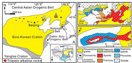 在上述背景下,中科院地质地球所岩石圈演化国家重点实验室朱昱升博士、杨进辉研究员和王浩副研究员等人选取华北克拉通北缘三叠纪赛马和河坎子碱性杂岩体作为研究对象(图1),通过岩相学、矿物学和地球化学研究,试图寻找示踪碱性岩源区性质和地幔交代过程的有效地球化学技术,深化碱性岩的岩石成因。