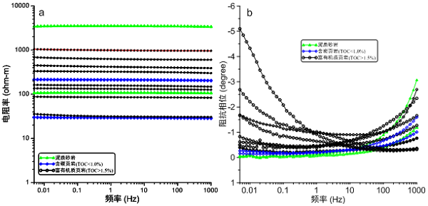 图1 砂岩、含碳页岩和富有机质页岩的复电阻率(a)和阻抗相位(b)曲线