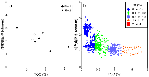 岩石圈演化国家重点实验室博士后何兰芳、陈凌研究员、成都理工大学王绪本教授、中国地质调查局成都地质矿产研究所汪正江教授及其合作者通过岩石学和电磁学交叉研究揭示了上扬子地区页岩气赋层-富有机质页岩的电磁学特征及其成因机理。研究结果表明:上扬子地区富有机质页岩具有低电阻率和高极化率的电磁学特征,高极化特征主要表现在频率小于1赫兹的低频段(图1)。经典的ΔlogR-TOC模型不适合上扬子地区的总有机碳(TOC)描述,上扬子地区富有机质页岩TOC含量与电阻率成反比(图2)。阻抗相位(代表极化率)可用于表征富有机质页岩的岩石学特征,与TOC、黄铁矿含量正相关,该项研究首次发现了石英含量和阻抗相位存在正相关关系。由于TOC、石英含量和黄铁矿含量都是页岩气评价的关键因素,因此岩石电磁学研究可建立页岩气电磁异常与储层评价之间的联系,并在此基础上开发页岩气甜点识别的新方法。