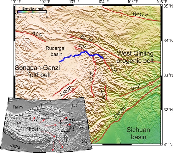 青藏高原发育数条大型左旋走滑断裂,如北部的阿尔金断裂、海原断裂、昆仑断裂等,以Tapponnier为代表的学者认为高原块体沿这些大型走滑断裂东向挤出和俯冲是高原东北向扩展的主要模式。但随着地球物理深部探测结果中壳内地震波低速区(层)和电磁低阻区(层)的不断发现,研究者更趋向于采用地壳流模型解释高原的侧向生长。若尔盖及相邻的西秦岭地势相对平缓,地壳流模型认为高原中部流出的地壳流在坚硬的四川盆地的阻挡下,转向东北,流向若尔盖、西秦岭,导致了该地区晚中新世以来的明显抬升。2017年8月8日岷江断裂和塔藏断裂之间的九寨沟发生7.0级地震,进一步增强了人们对该地区地壳结构和地壳增厚、高原抬升机制的关注。