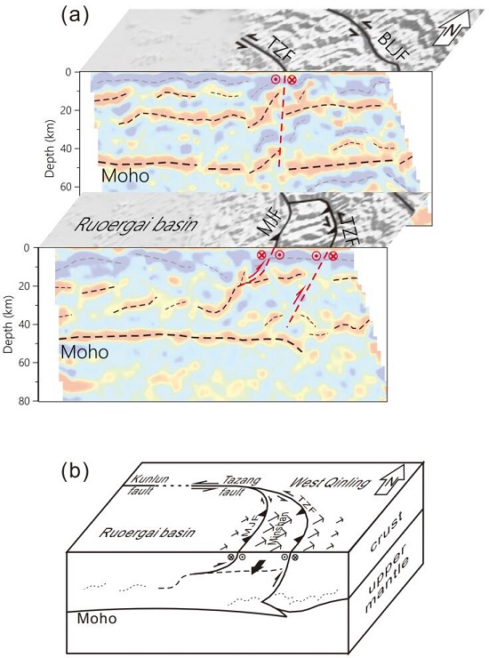 观测结果与地壳流模型预测的断裂终止于上地壳底部、地壳流增加地壳速度比等特征明显不同;从成像结果可以看出该地区的地壳增厚和高原抬升主要来自块体自身缩短和中、上地壳向高原外侧逆冲推覆的贡献。这一结论认为东北缘的高原扩展和抬升主要受控于大型走滑断裂,而不是地壳流横向流动的结果。例如,东昆仑左旋走滑断裂向东延伸至塔藏断裂后,断裂的走向由近东西转向为近南北,使得左旋走滑运动顺势转变为东向逆冲,最终导致了该地区的地壳增厚和高原抬升(如图2b)。
