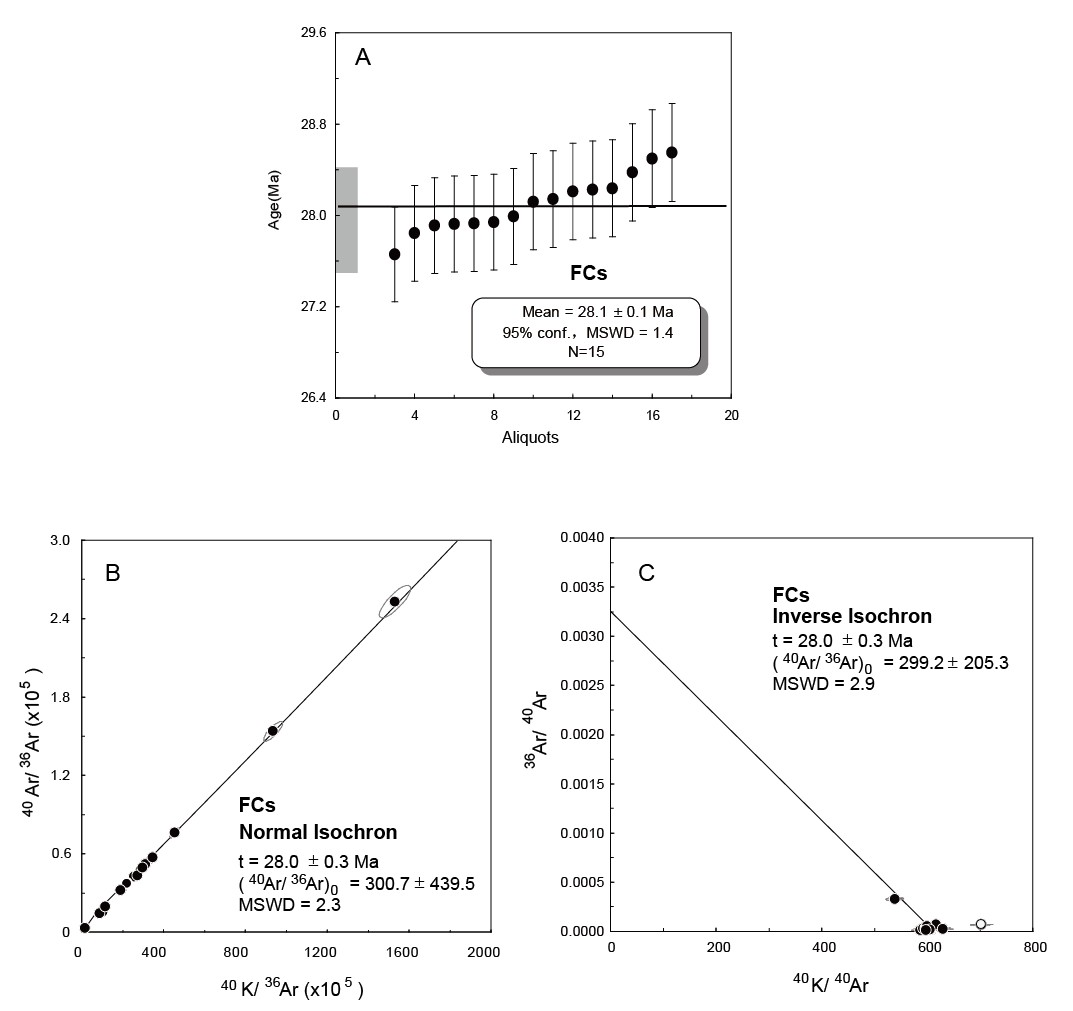 图1 激光无稀释剂K-Ar法测定国际标准样品FCs (表面年龄和等时线年龄, 参考值为28.1±0.1 Ma)