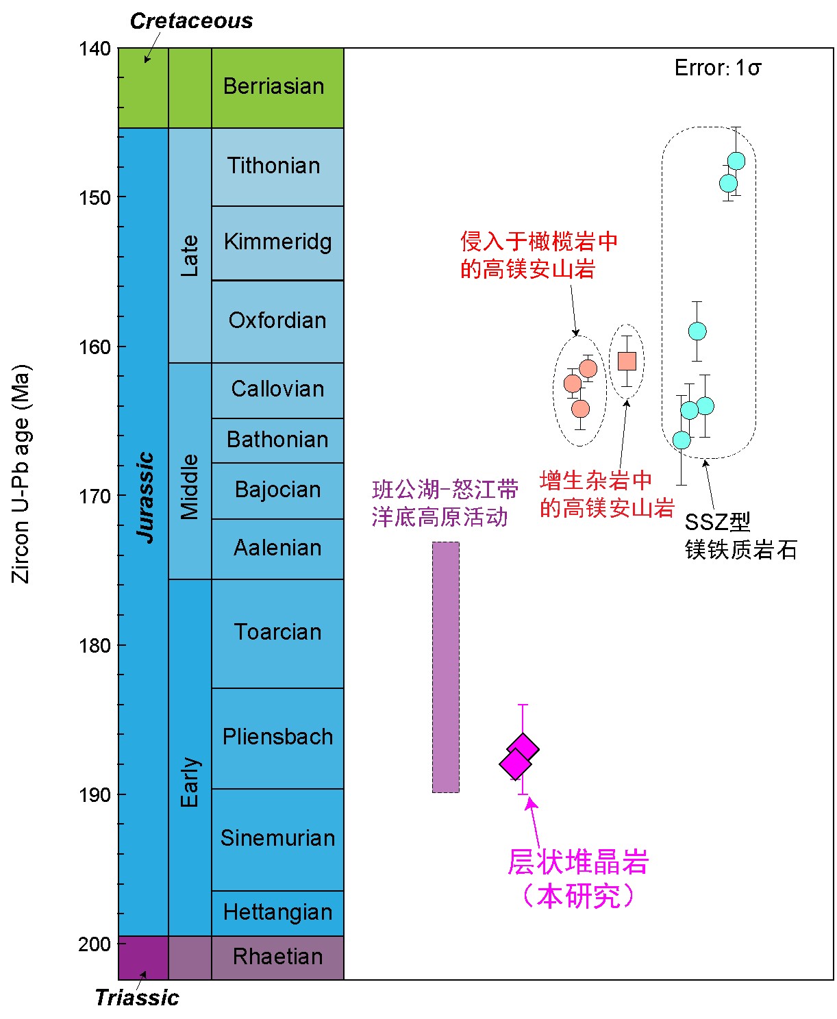 针对这一科学问题,中科院地质与地球物理研究所岩石圈演化国家重点实验室张维骐博士研究生在导师刘传周研究员的指导下对班公湖-怒江蛇绿岩带中段蓬错蛇绿混杂岩中的层状镁铁质-超镁铁质堆晶岩体进行了系统的锆石年代学、岩石学和地球化学研究。蓬错层状堆晶岩体主体岩性为纯橄岩-橄长岩-橄榄辉长岩-斜长岩,局部发育有橄长质伟晶岩脉。对从岩脉挑选出的锆石进行U-Pb定年,获得的年龄为187-188 Ma(图1)。全岩与矿物的主、微量元素表明蓬错堆晶岩的母岩浆具有贫水、低硅的特征。然而通过计算获得,与单斜辉石平衡的熔体具有富镁(Mg#≥79)和超亏损的性质。考虑到这些特征明显不同于洋中脊以及俯冲带构造背景下的岩浆特征,从而提出它们的母岩浆来源于受地幔柱影响下难熔地幔发生熔融的产物,这些难熔地幔既可能是先存的大洋岩石圈地幔,也可能是卷入在地幔柱中的难熔组分。因此,我们提出蓬错堆晶岩体为早侏罗世(187-188 Ma)在中特提斯形成的洋底高原下地壳的残片。