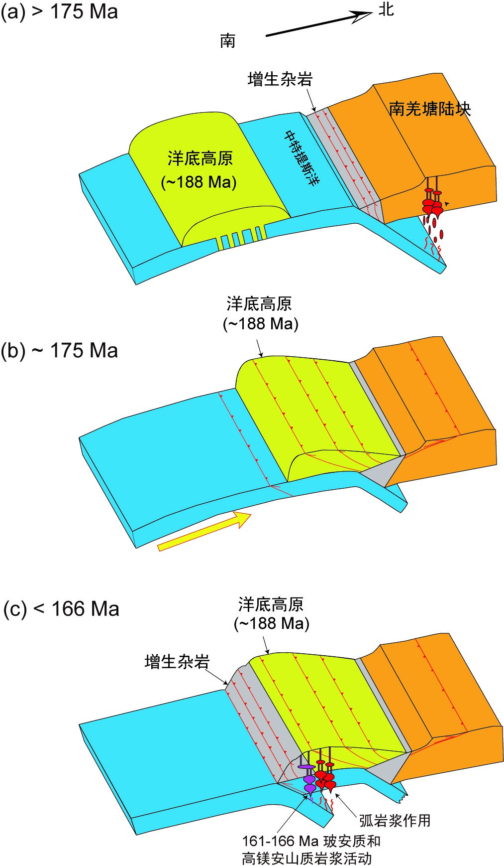然而,已有的研究表明蓬错蛇绿岩出露的喷出岩主要为中晚侏罗世的SSZ型岩浆岩,包括~161-166 Ma弧前成因的玻安岩、高镁安山岩以及~159 Ma的岛弧玄武质的辉绿岩墙,此外还包含149-167 Ma的SSZ成因辉长岩(图1)。为了解释蓬错蛇绿岩喷出岩与堆晶岩在年龄与地球化学性质上的差异,建立了班公湖-怒江中特提斯洋在侏罗纪经历的洋底高原-海沟碰撞、俯冲再起始的地球动力学模型(图2),即洋底高原在早侏罗世(187-188 Ma)形成后继续向北运移,于~175 Ma进入海沟并发生碰撞阻塞,导致俯冲带由北向南迁移,并诱发中特提斯洋壳重新开始俯冲,形成~161-166 Ma的玻安岩、高镁安山岩,以及更晚期的俯冲岩浆作用。