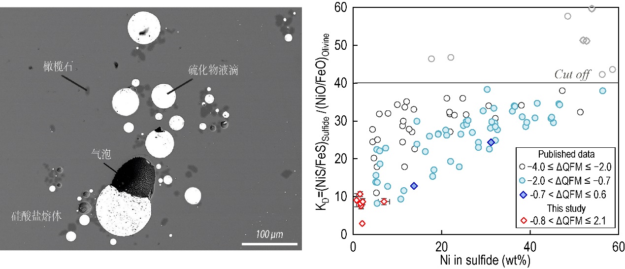 图1. 较高氧逸度条件下橄榄石-硫化物Fe-Ni交换反应的实验产物(左图)、该研究的实验条件与前人实验条件的对比(右图)