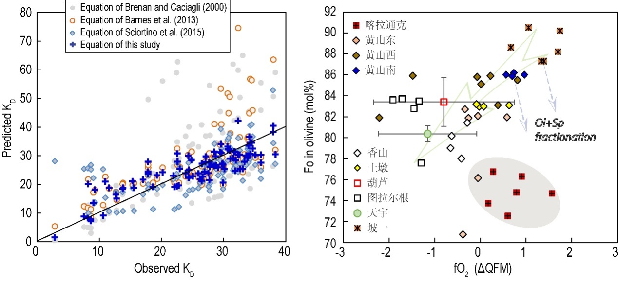 图2. Fe/Ni在橄榄石与硫化物之间的分配系数(KD)的计算结果对比(左图);改进的氧逸度计算公式在中亚造山带铜镍矿床中的应用(右图)