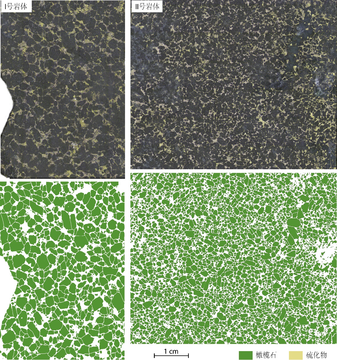 图3.金川矿床I号岩体和II号岩体海绵陨铁状矿石照片(上图)与通过XRF扫描图像还原的橄榄石颗粒分布图(下图),海绵陨铁状矿石是橄榄岩赋矿矿床的典型矿石