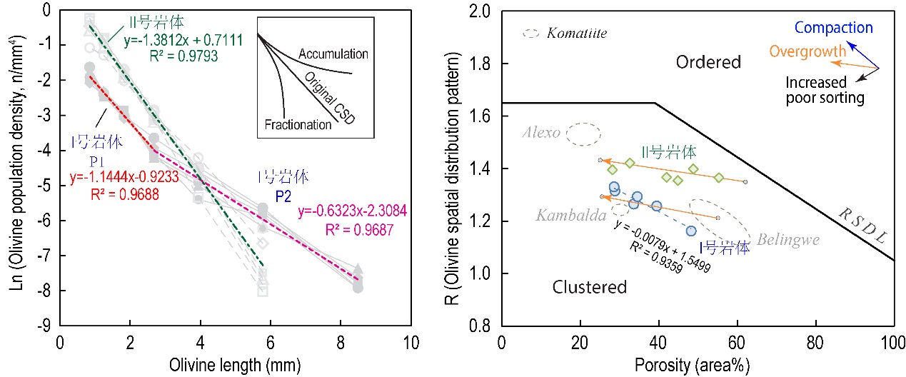 图4.金川矿床I号岩体和II号岩体橄榄石的粒度分布图解(左图,CSD图解,详见Marsh et al., 1988),与橄榄石空间分布图解(右图,SDP图解,详见Jerram et al., 1996)
