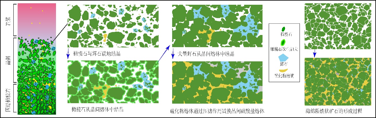 图5.海绵陨铁状矿石形成过程模式图:在橄榄石结晶之后,晶间连通的硫化物熔体通过重力作用向下压滤运移并置换晶间的硅酸盐熔体形成海绵陨铁状矿石