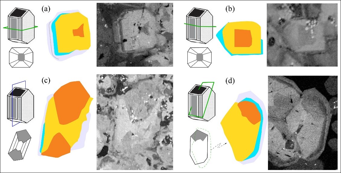 图1 黄山矿床斜方辉石的铬元素的内部扇形分区环带与外部正-反环带(橙色与黄色显示分区环带,蓝色与紫色显示外部环带,分区环带的样式取决于矿物的截面)