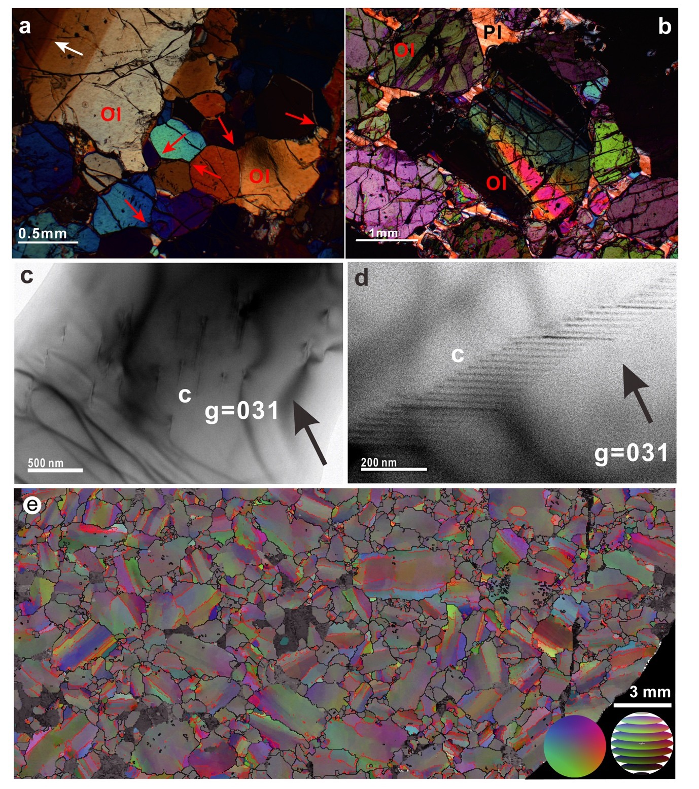 图1 (a, b)坡一岩体橄榄石的波状消光(晶格位错的热恢复作用)及三联点(颗粒边界的滑移); (c, d) 透射电镜下橄榄石晶格尺度的位错分布和排列; (e)EBSD剖面中的晶格变形和位错壁