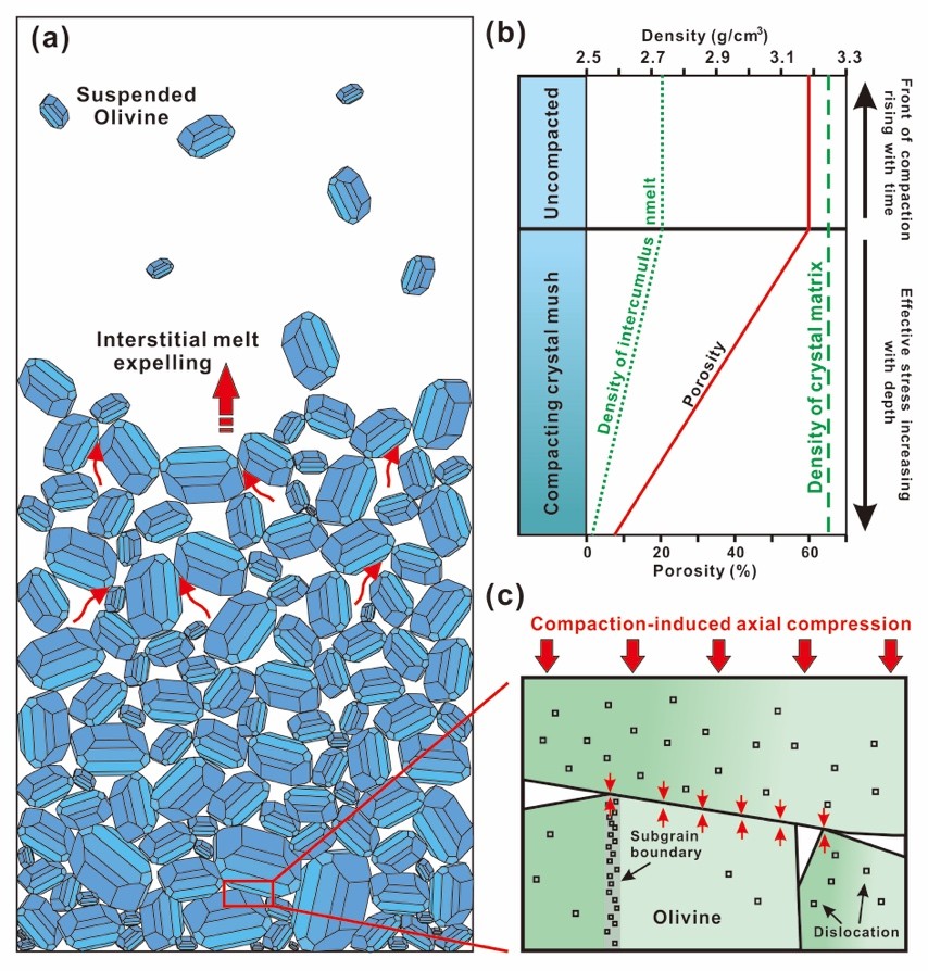 (1)坡一纯橄榄岩的全岩微量及矿物成分特征表明其形成于岩浆的堆晶过程,而非高程度部分熔融或熔岩反应的产物。同时该岩体巨厚晶粥层发生了强烈堆晶压实过程,晶体框架与填隙熔体间密度差异产生的有效应力(~2-10 MPa)触发了橄榄石的晶格变形;