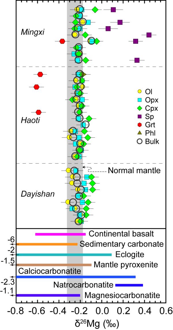 实验室苏本勋研究员等对东北大椅山、华南明溪和西秦岭好梯的地幔橄榄岩进行了单矿物的Mg同位素分析。这些经历了不同程度地幔碳酸盐交代的样品中主要的橄榄石和辉石均显示正常地幔或略高于正常地幔的δ26Mg值,副矿物尖晶石和石榴石分别为较高和较低的δ26Mg值(图1),因而其全岩的Mg同位素组成与正常地幔一致。这一结果表明碳酸盐交代的地幔橄榄岩应该不是轻Mg玄武岩的源区,即碳酸盐交代作用不是碳酸盐物质加入玄武岩源区的途径。