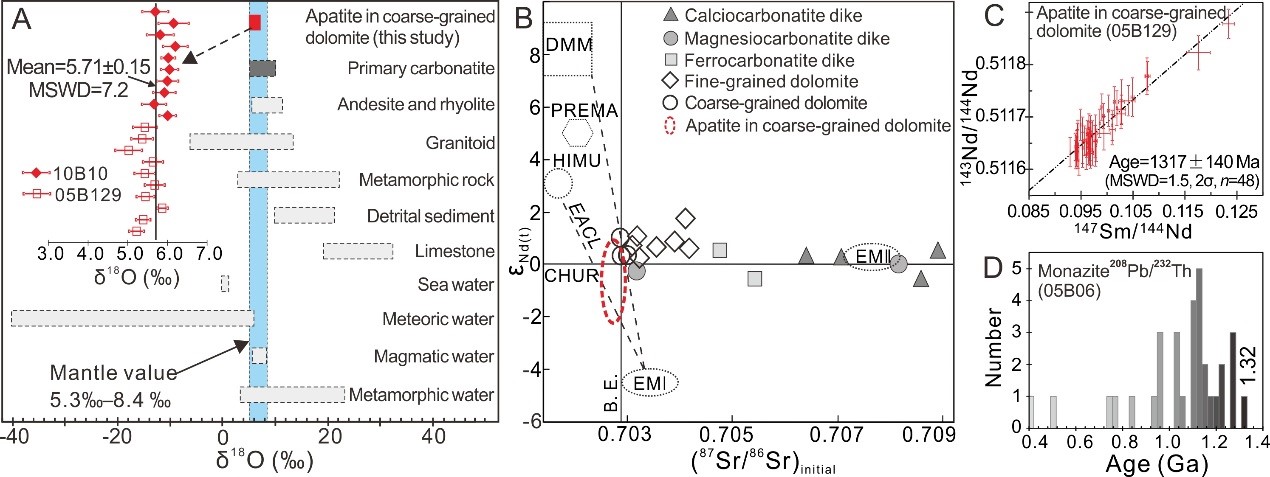 实验室杨奎锋副研究员和范宏瑞研究员等,对白云鄂博地区粗粒含矿白云岩中的磷灰石进行原位Sr-Nd-O同位素分析。磷灰石的O同位素组成与地幔来源碳酸岩一致,Sr-Nd同位素组成与碳酸岩脉相近,磷灰石的Sm-Nd等时线年龄也与钙质碳酸岩脉中独居石的Th-Pb年龄相符(图1)。结合粗粒白云岩的主量元素组成,以及磷灰石中共生的自形烧绿石矿物包裹体和球状初始碳酸盐岩包裹体,可以确定粗粒含矿白云岩为镁质岩浆碳酸岩。