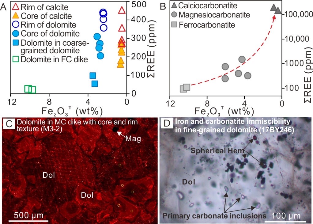 白云鄂博稀土-铌-铁矿床的稀土资源量位居全球首位。自丁道衡先生1927年首次在白云鄂博发现铁矿体,何作霖先生1935年在铁矿体中发现稀土矿物以来,世界各地的科研人员对白云鄂博地区进行了多方面综合研究,取得了大量重要成果。但由于白云鄂博矿床具有十分复杂的元素及矿物组成,又经历了多期地质事件的叠加改造,有关含矿白云岩的成因问题一直以来就存在非常大的争议,而巨量稀土元素的富集机理仍是未解之谜。岩浆碳酸岩是全球稀土矿床最主要的成矿岩石。白云鄂博地区发育大量的岩浆碳酸岩脉,晚期钙质碳酸岩脉中的稀土氧化物含量甚至超过20%。碳酸岩浆强烈分异演化过程中的稀土富集机理是解决白云鄂博谜题的突破口。