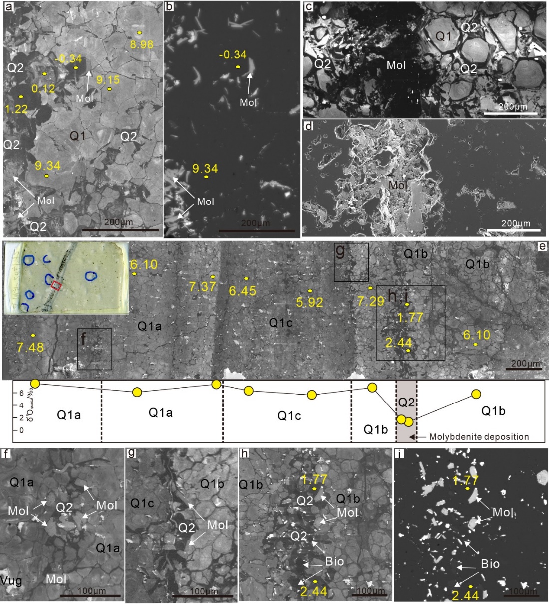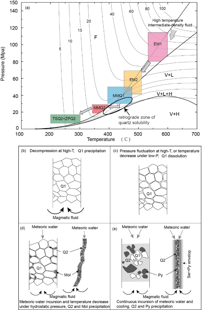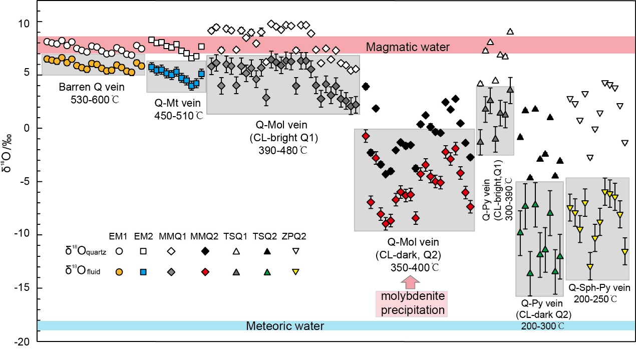 (3)Q1和Q2不同的CL和氧同位素特征表明,天水流体进入到热液系统的时间早于辉钼矿的沉淀。大量辉钼矿的集中沉淀直接受到天水流体与岩浆热液流体混合所导致的流体温度下降控制。