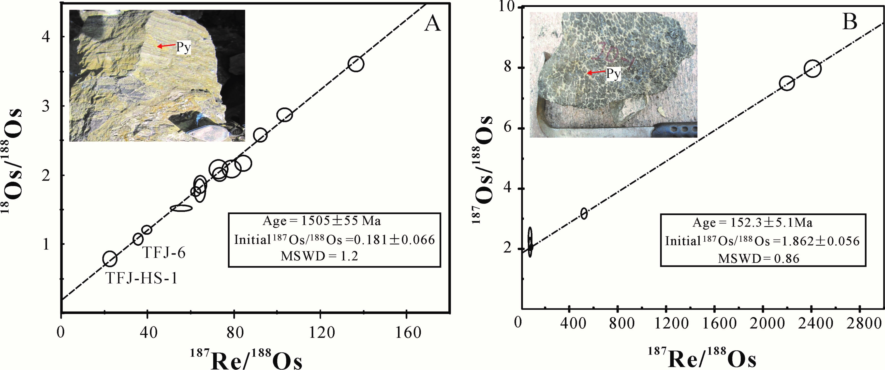 图2 同沉积成因黄铁矿Re-Os等时线(A);热液改造成因黄铁矿Re-Os等时线(B)
