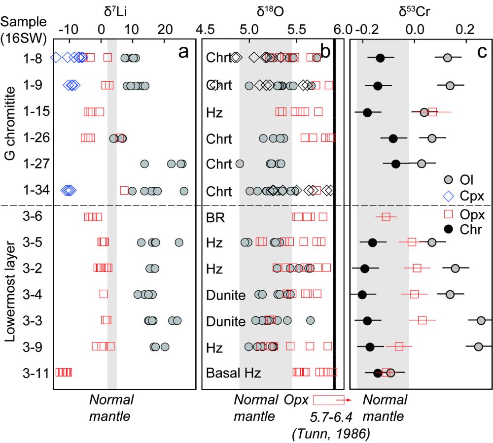 我实验室苏本勋研究员及其合作者,对北美Stillwater大型层状镁铁-超镁铁杂岩体的超镁铁岩和铬铁矿石进行了细致的矿物岩石学观察和元素及Li-O同位素分析。结果显示: