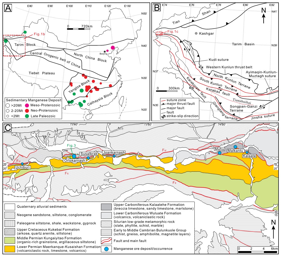 图1 (A)中国构造地质简图,展示主要沉积锰矿床的时空分布。(B)西昆仑造山带构造简图。(C)西昆仑造山带西北缘玛尔坎苏大型碳酸锰成矿带地质简图。