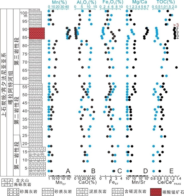 图2 上石炭统喀拉阿特河组所选取的主量元素及其相应富集系数(A)Mn和MnEF,(B)Al2O3和CaO,(C)Fe2O3和FeEF,(D)Mn/Sr和Ca/Mg比值,(E)TOC含量和Ce异常的地层剖面分布。富集因子相对于后太古代澳大利亚页岩(PAAS)计算。
