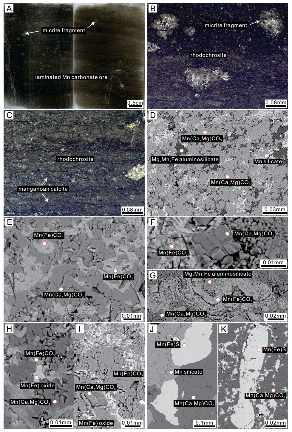 图3 显微照片显示锰矿石的典型结构及组成。矿石多呈层纹状构造(A);矿石主要由菱锰矿(MnCO3,含量达95%以上)组成 (B-D);有的团块状菱锰矿(图3E)和菱面体状菱锰矿(图3F)被化学成分为Mn0.98Fe0.02CO3的菱锰矿胶结;有的具似叠层石构造(图3G);可见Mn(II)碳酸盐矿物交代Mn(III/IV)氧化物颗粒的现象(图3H),亦可见沿着锰碳酸盐矿物边缘发育的次生锰氧化物(图3I);亦见少量红铁锰矿、富锰绿泥石及硫锰矿(J-K)。