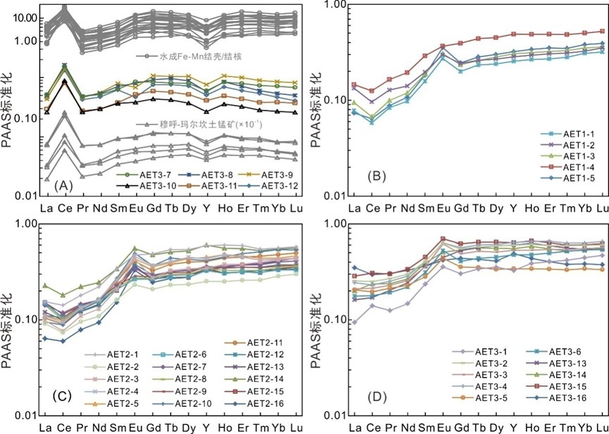 图4 经后太古代澳大利亚页岩(PAAS)标准化的奥尔托喀讷什碳酸锰矿石及相关围岩的REE+Y分布模式。A.喀拉阿特河组第三岩性段碳酸锰矿石。B.喀拉阿特河组第一岩性段砂屑灰岩和砂质灰岩。C.喀拉阿特河组第二岩性段砂质灰岩、泥质灰岩和泥灰岩。D.喀拉阿特河组第三岩性段泥灰岩和泥质石灰岩。