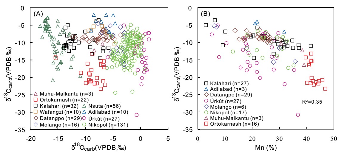 图5 全球主要碳酸锰矿床的C同位素组成特征(A)及其与Mn含量关系(B)