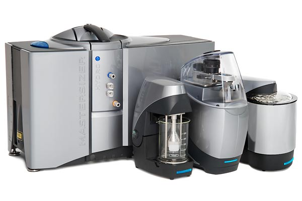 Mastersizer 3000 激光衍射粒度分析仪(MS3000)是英国Malvern仪器有限公司研发的新一代粒度分析系统,2013年3月引进本实验室。MS3000采用632.8nm波长的He-Ne激光光源,辅以固体蓝光光源,单色性好,稳定性高。采用反傅立叶光路配置,将测量腔置于聚焦透镜之后,便于检测器大角度排列。检测器采用非均匀交叉、大面积补偿(大角度大面积)的对数间隔排列,保证了全量程信号检测的分辨率和信噪比。