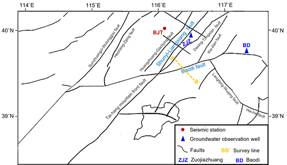 最近,中国科学院地质与地球物理研究所页岩气与地质工程院重点实验室的张艳副研究员、黄天明研究员、祁生文研究员与美国加州大学伯克利分校的Michael Manga教授等人合作,选择了相距~50 km远的两口地下水观测井(北京左家庄井(ZJZ)和天津宝坻井(BD))(图1)研究地震如何对不同性质的含水层产生影响。