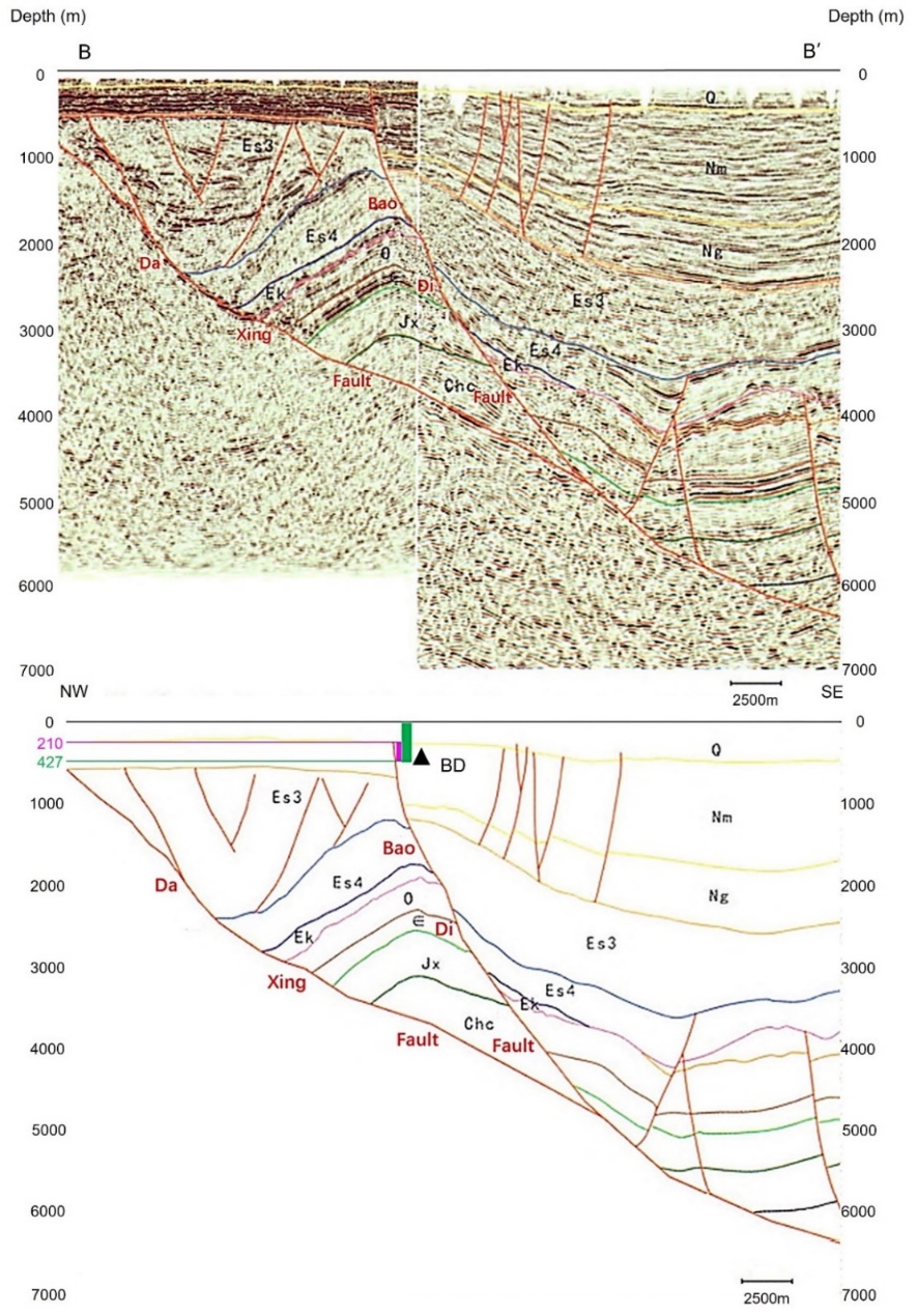 图2 西北-东南地震(地震偏移成像)和沿BB′测线(图1)的地质剖面,修改自He et al.(2017)。绿色条表示井位,粉色条表示观测含水层,与Boadi井(BD)相交的断层倾角为50-65度。Q: 第四纪;Nm: 明化镇组;Ng: 馆陶组;Es3: 沙河街组(第三段);Es4: 沙河街组(第四段);Ek: 孔店组;Chc: 常州沟组;Jx: 蓟县系;Є:寒武纪