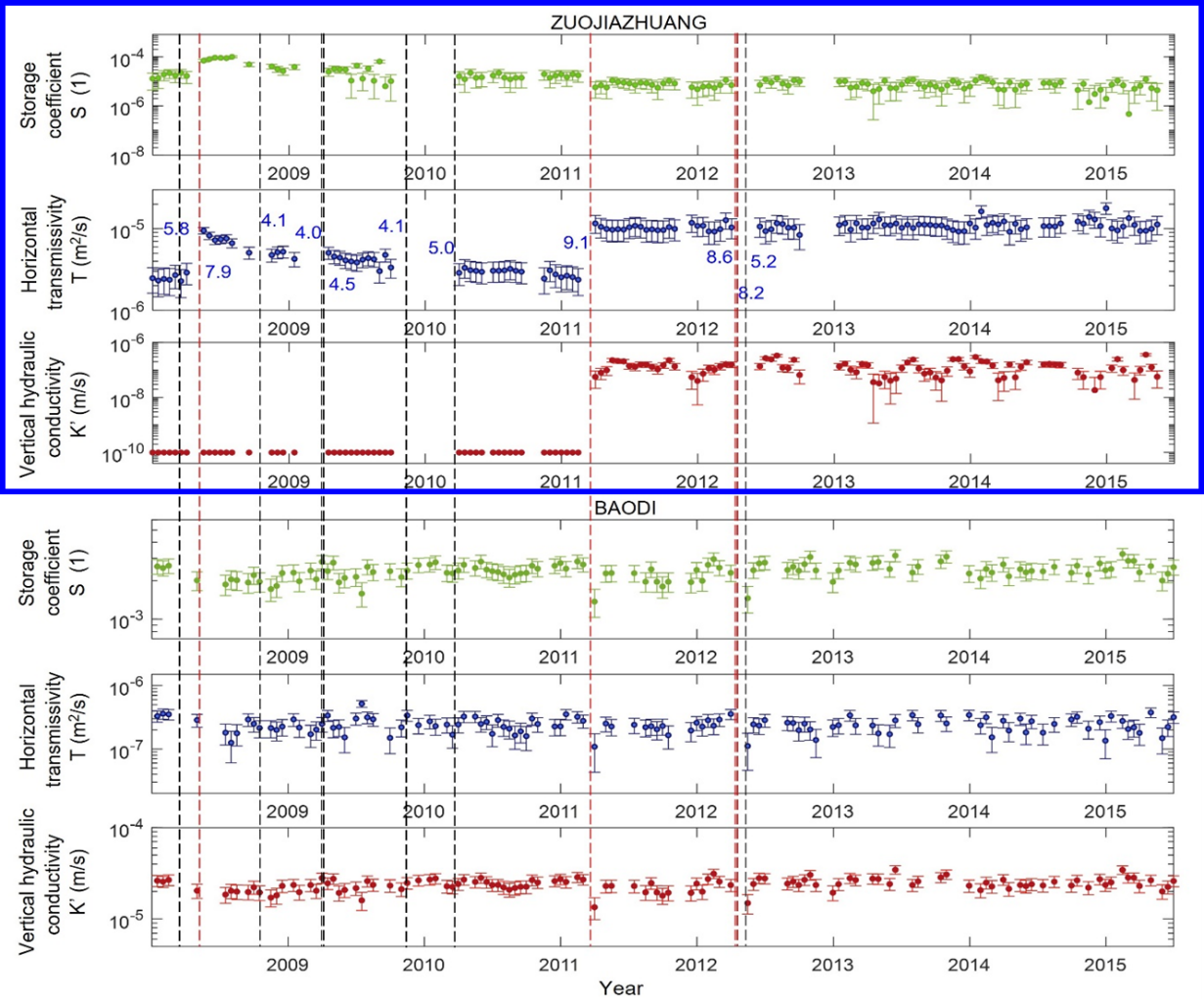 图3 按照潮汐响应的渗漏模型计算得到:左家庄(ZJZ)和宝坻(BD)井随时间变化的隔水层垂直向渗透系数(K′)、含水层水平向导水系数(T)和储水系数(S)的变化曲线。在2011年Mw 9.1 Tohoku地震后,ZJZ井的渗透率变化没有恢复。竖线表示引起水位变化的地震日期和震级,红线表示地震也引起了计算得到的裂缝走向的变化。研究发现左家庄井的观测条件适合该渗漏模型