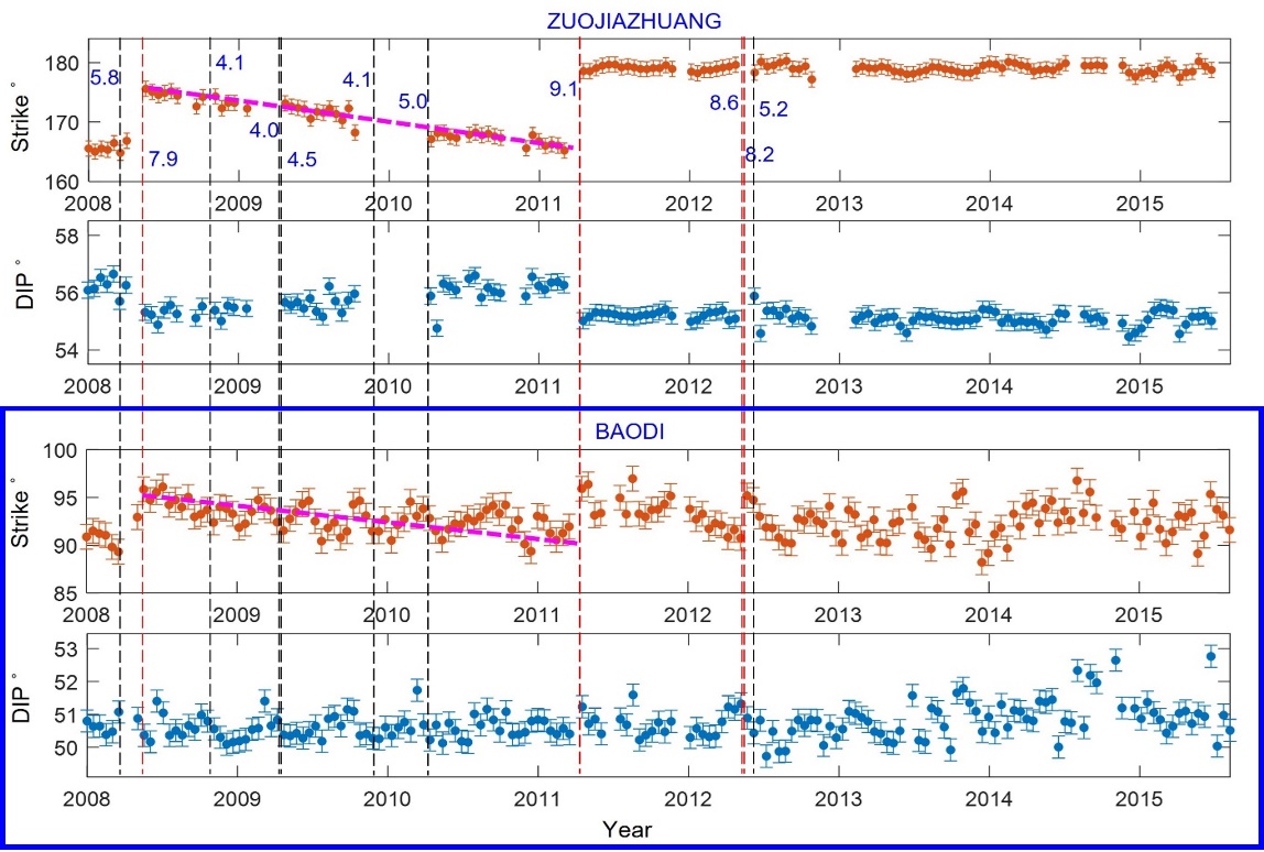 图4 按照潮汐响应的裂隙模型计算得到:左家庄(ZJZ)和宝坻(BD)井随时间变化的裂缝走向和倾角。2008年Mw 7.9汶川地震发生后,左家庄和宝坻都发生了明显的同震裂隙走向变化并且随着时间推移(三年左右)都逐渐恢复到地震前的数值,但在2011年Mw 9.1 Tohoku地震后,ZJZ井的走向变化没有恢复。竖线表示引起水位变化的地震日期和震级,红线表示地震也引起了计算得到的裂缝走向的变化。研究发现宝坻井的观测条件适合该裂隙模型