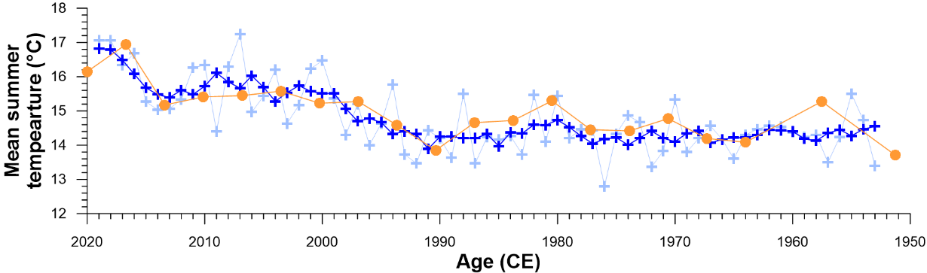 图1 重建和器测的夏季温度对比。橙色圆点为重建夏季温度,浅蓝和深蓝色十字分别为器测的每年夏季记录和5年平均(滑动平均)夏季温度