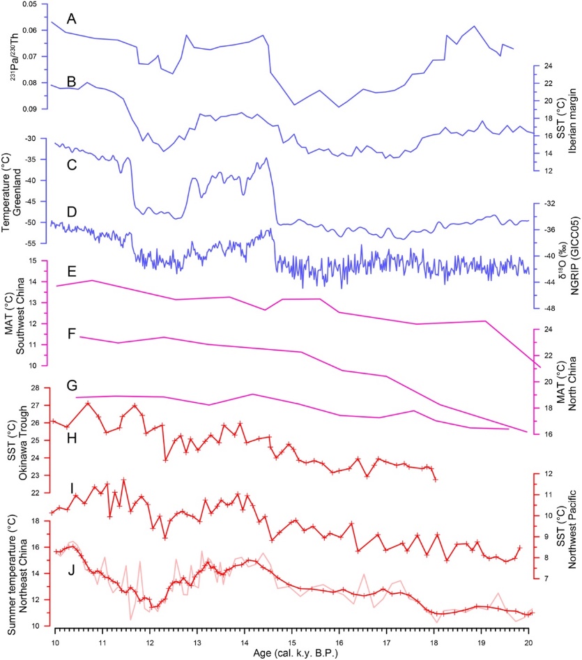 图2 北大西洋,西北太平洋和东亚地区温度记录对比。A .AMOC强度指标;B.北大西洋温度记录;C.格陵兰温度记录;D.格陵兰冰芯氧同位素;E-G.东亚地区年均温度记录;H- I.西北太平洋海表温度记录;J.基尔果天池夏季温度记录(本研究)