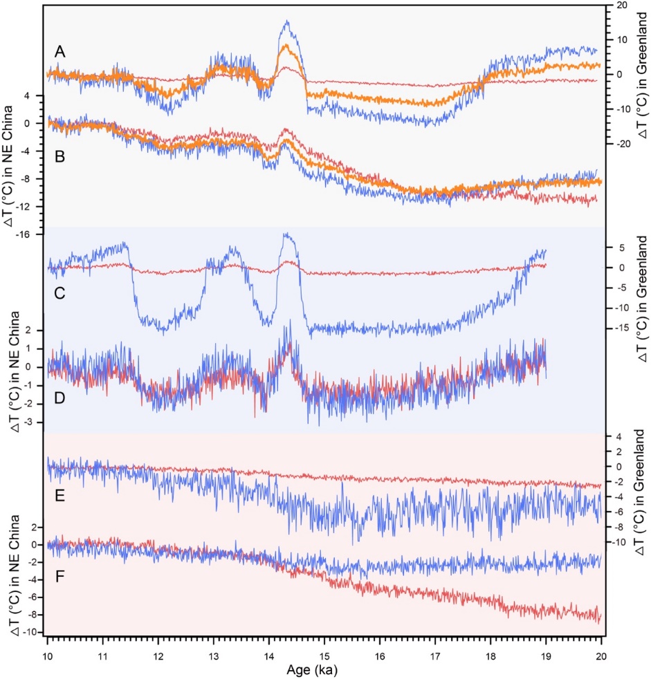 图3 Trace-21ka 模拟结果。A-B.格陵兰和东北地区夏季(红色,下同)、冬季(蓝色,下同)和年均温度(橙色)变化对比;C-D.融水单因子模拟结果对比;E-F.太阳辐射单因子模拟结果对比
