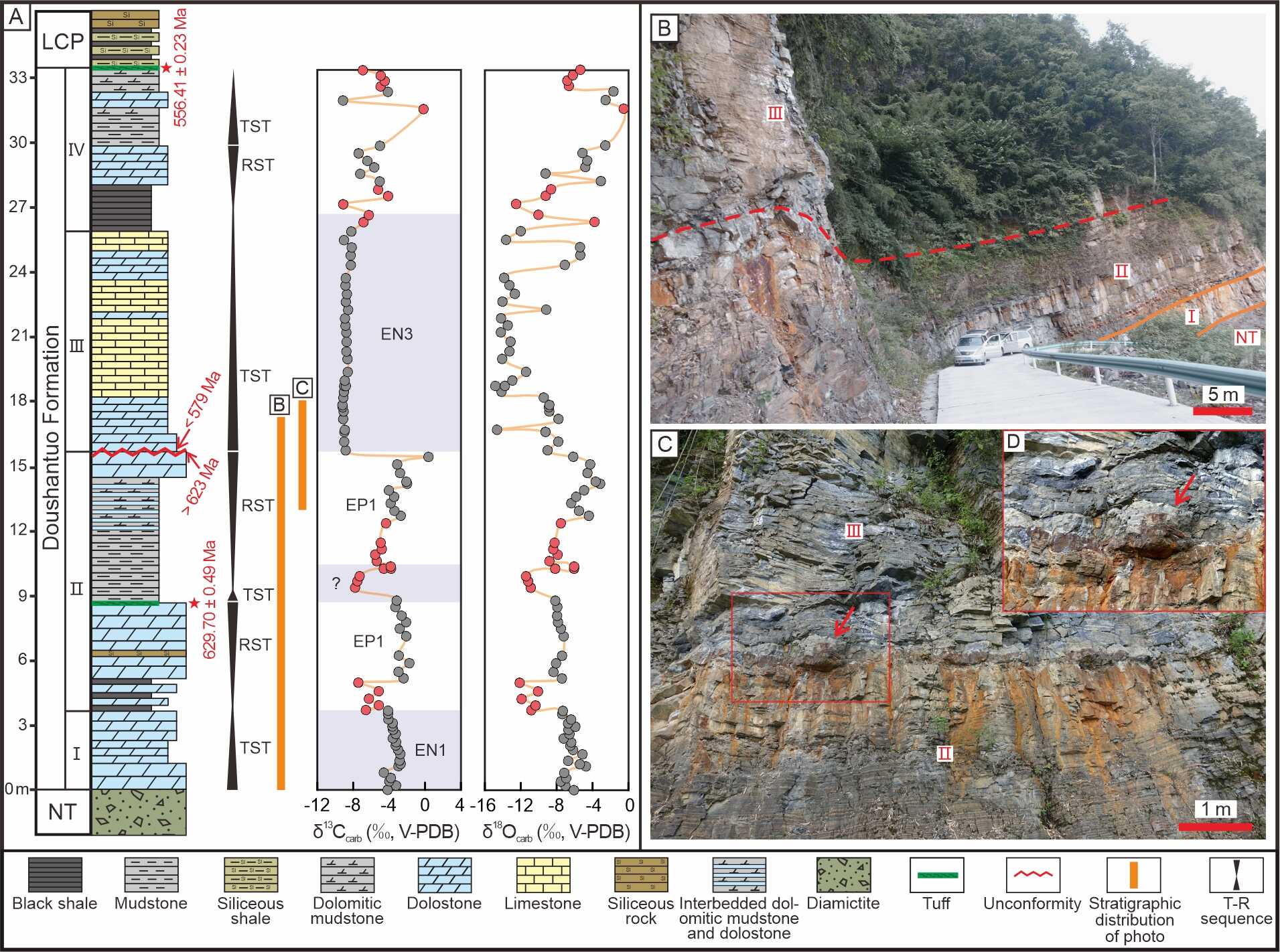 图3 (A)本研究的六龙山剖面陡山沱组的岩性-层序-碳同位素化学-年代地层综合序列。五角星代表本文火山灰锆石高精度定年的层位;(B)成冰系南沱组至埃迪卡拉系陡山沱组第三段的野外露头照片;(C-D)陡山沱组第二段与第三段界线处的重要不整合面,以侵蚀面和岩性变化为特征