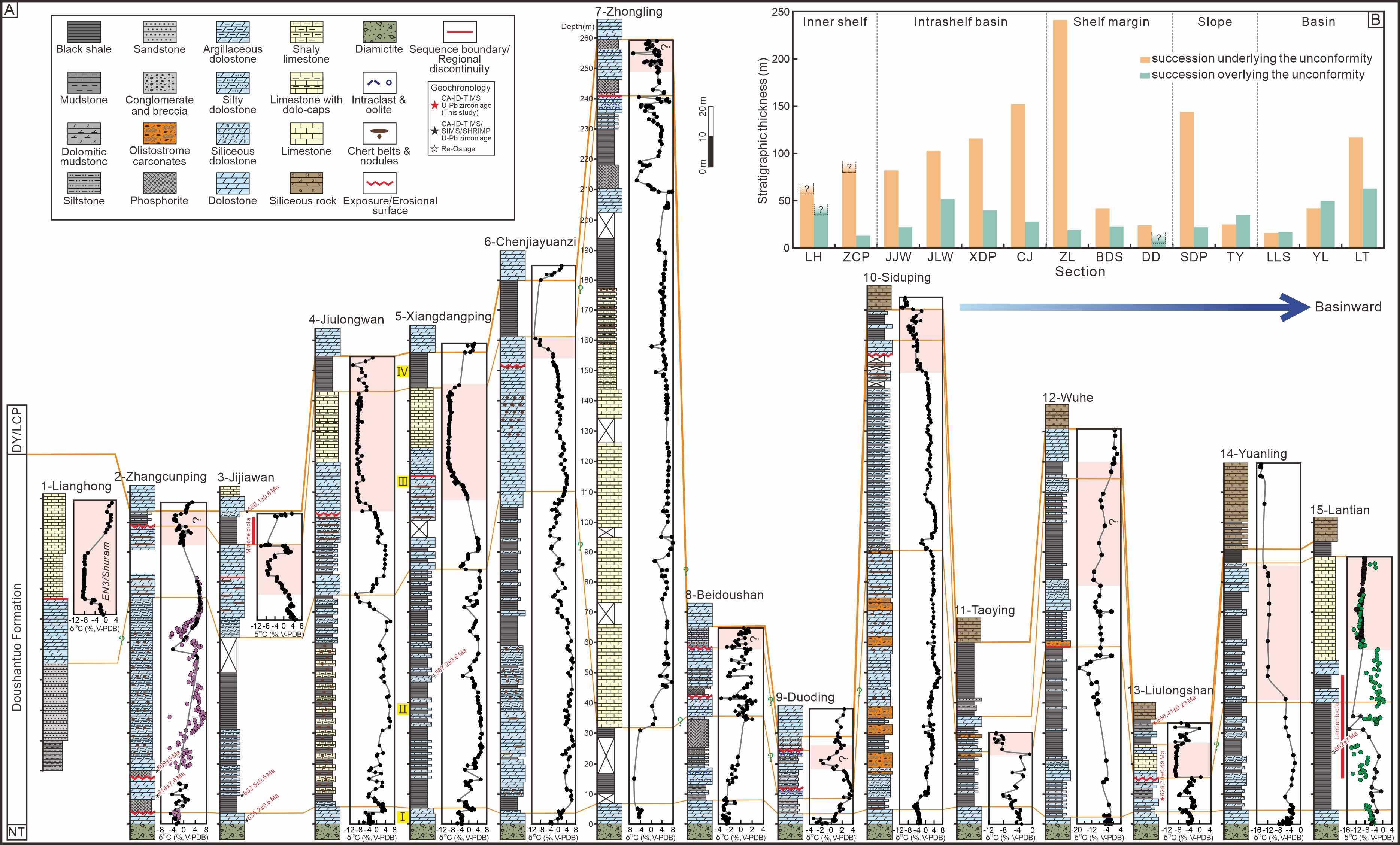 研究者选取位于传统普遍认为的“深水盆地”沉积相带(应该记录了连续沉积)里的一个关键剖面(图2),建立了陡山沱组岩石-层序-碳同位素化学综合地层,厘定了其沉积序列和层段(图3),并进行了区域对比。重要的是,该剖面陡山沱组第二段中部(LLSB-T1)和该组顶部(LLSB-T2B)分别发育一层火山灰,其高精度锆石CA-ID-TIMSU-Pb定年结果为629.70 ± 0.49 Ma和556.41 ± 0.23 Ma(图3A),提供了重要的地层时间锚点。同时,该剖面陡山沱组第三段白云岩-灰岩层段发育具有全球可对比的EN3/Shuram碳同位素负漂事件特征,其底界年龄(负漂事件启动时间)被认为至少<579 Ma,可提供另一个地层时间锚点。因此,该剖面陡山沱组的沉积时间跨度约79百万年(~635–556 Ma),但地层总厚度仅有约33米(图3A)。传统上,陡山沱组这种现象常被认为可能是“沉积速率极低导致地层极其凝缩”。然而,该剖面陡山沱组岩性组合和垂向变化特征(图3),并不能很好地支持上述认识。事实上,更多地层学证据表明,该地层内部可能存在严重的沉积记录缺失。