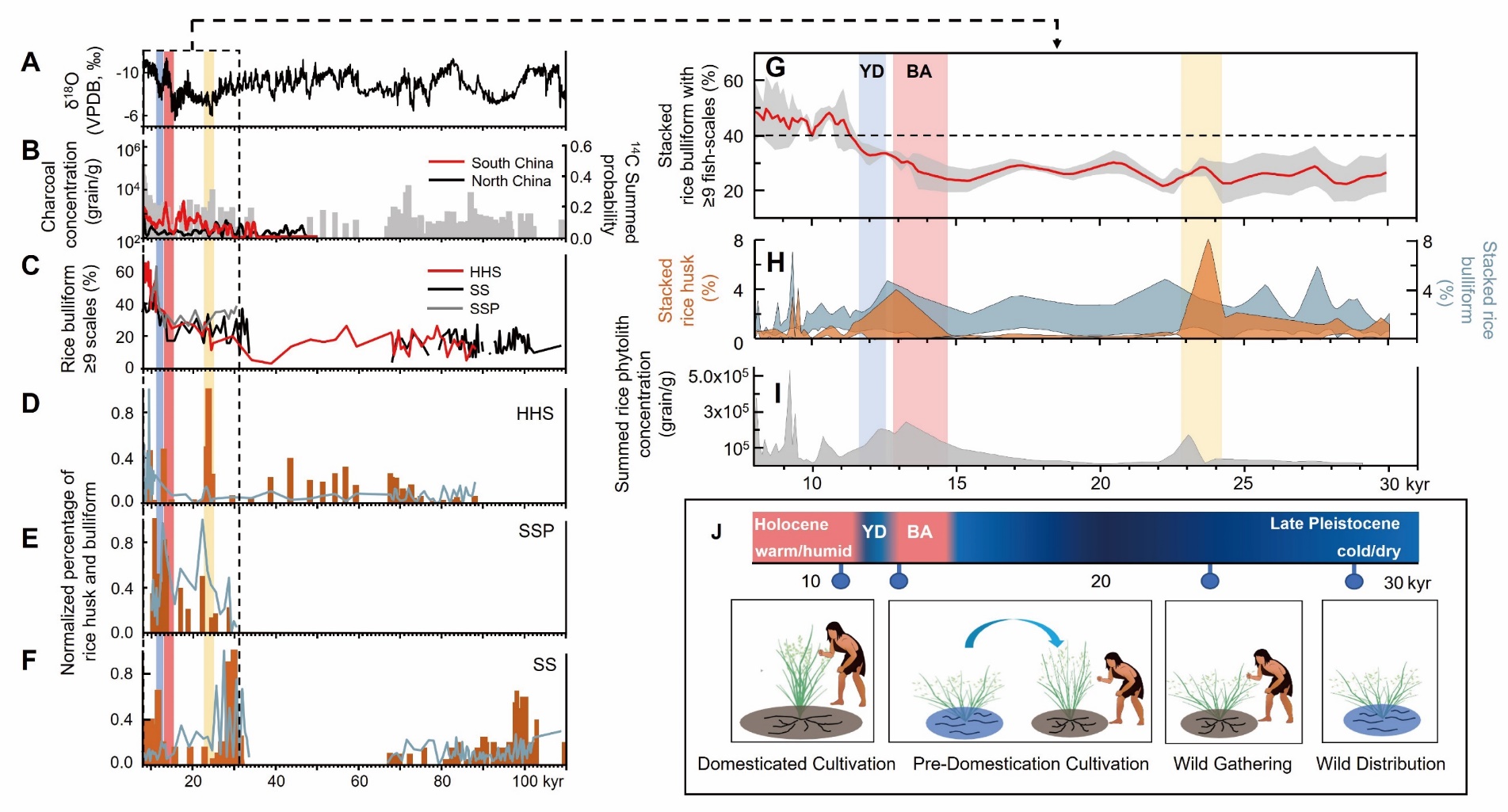 图1 过去 10万年以来长江下游地区水稻驯化利用的综合记录。(A) 东亚石笋的 δ18O(黑线)(Cheng et al.,2016);(B) 炭屑浓度(灰色条)和全国14C概率密度总和(红线为华南地区的结果,黑线为华北地区的结果)(Wang et al.,2014);(C) 来自 SS(黑色,上山遗址)、SSP(灰色,上山遗址)和 HHS(红色,荷花山遗址)部分的≥9鱼鳞纹水稻扇型植硅体百分比;(D-F) 来自 HHS、SSP 和 SS 的水稻壳(橙色条)和扇型植硅体(浅蓝线)百分比;(G) 30 000~8 000 年前 SS、SSP 和 HHS 中≥9鱼鳞纹的水稻扇型植硅体的平均百分比堆叠记录(平均值+/-标准差),灰色区域表示标准差 (SD);(H) 来自 SS、SSP 和 HHS 的水稻壳(橙红色)和扇型植硅体(浅蓝色)的平均百分比及其标准差(平均值+/-标准差);(I) 来自 SS、SSP 和 HHS 的水稻壳和扇型植硅体的浓度总和;(J) 自 3万年前以来长江下游地区水稻驯化利用的概念模型。淡黄色条表示触发水稻开发的 LGM。浅粉色条表示温暖的 Bølling-Allerød 事件(BA),该事件为野生稻的预驯化栽培做出了贡献。浅蓝色条表示寒冷的新仙女木期(YD),对野生稻的驯化过程影响有限