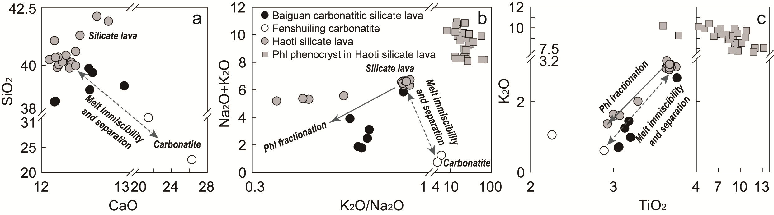 图2 西秦岭玄武质岩石及碳酸岩经历了熔体不混溶和金云母分离结晶过程的地球化学证据