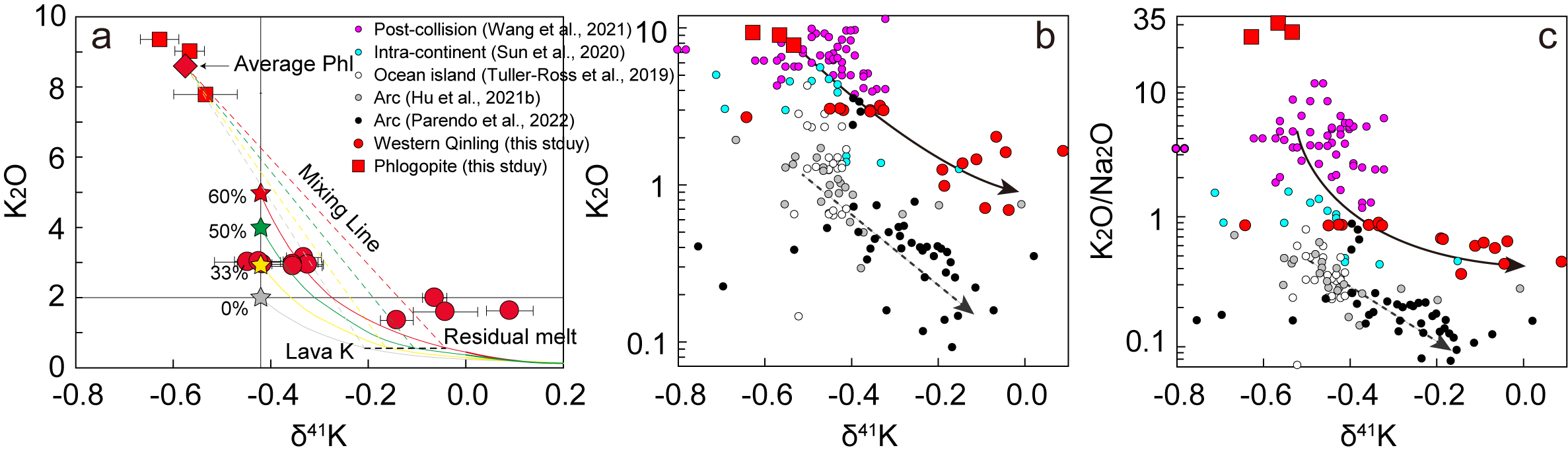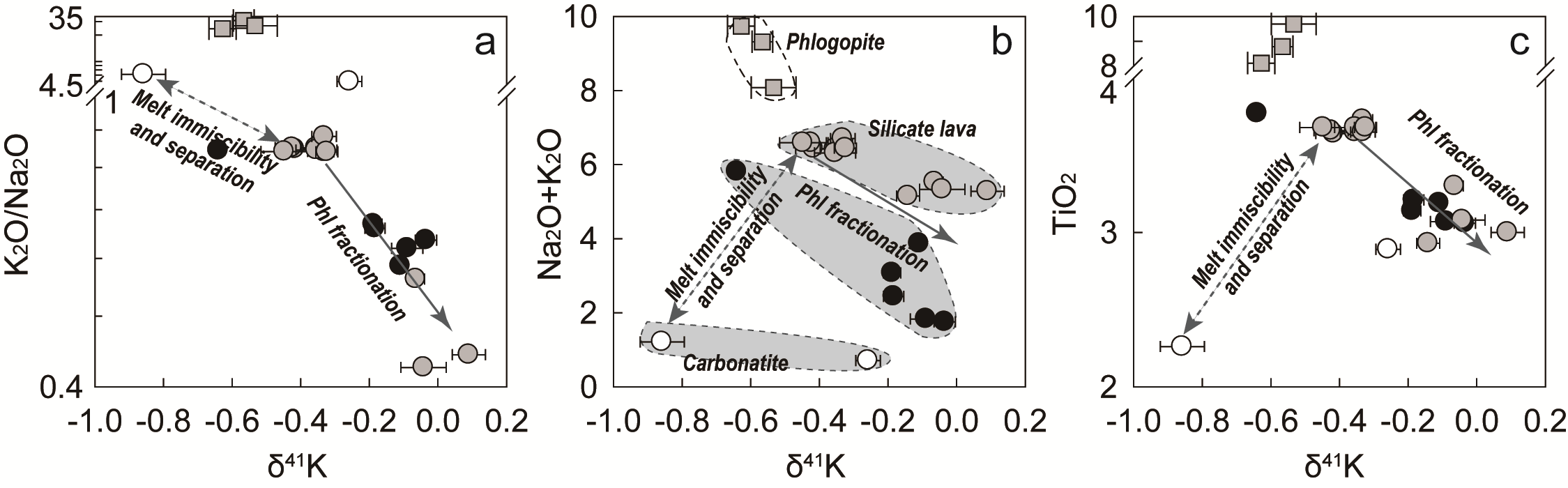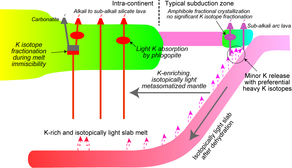 近年来,钾(K)同位素的高精度分析技术快速发展并被广泛用于各种地质过程示踪。K作为流体活动性元素,在大多数情况下,其重同位素更倾向于进入流体相。例如俯冲板块脱水释放重K同位素而产生高δ41K的弧岩浆,理论上脱水后的板块进一步熔融则会产生同位素相对较轻的岩浆作用。然而后碰撞和板内环境的一些钾质-超钾质岩石并未显示比弧岩浆更轻的钾同位素组成。钾质-超钾质岩石的形成通常会经历富K矿物的分离结晶和/或熔体不混溶作用,这两个过程能否引起K同位素分馏尚存疑问。