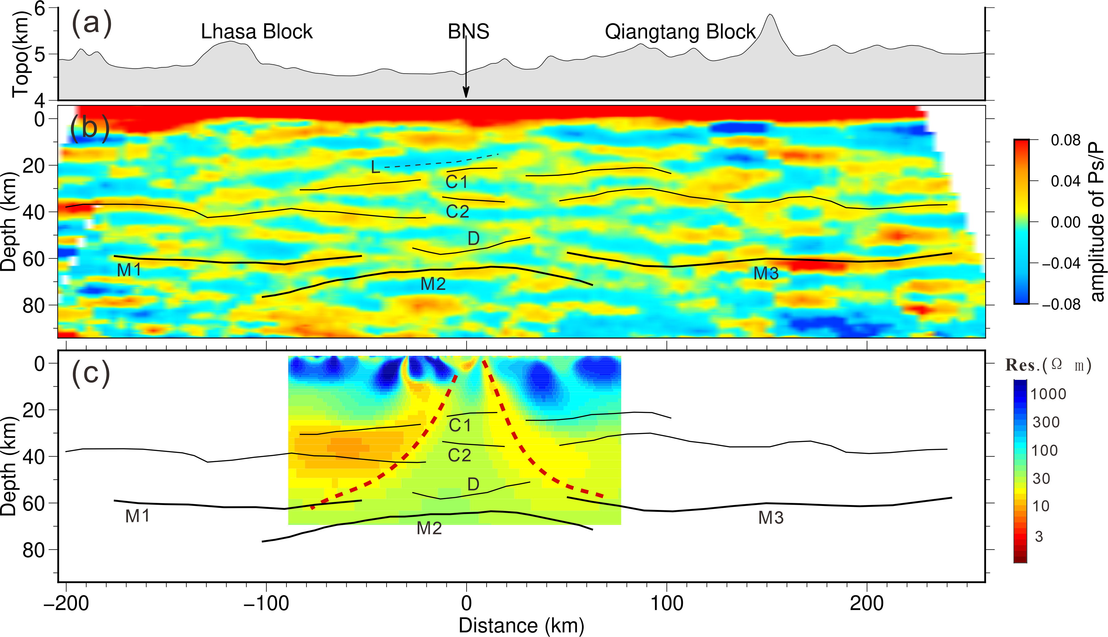 图2 (a)测线位置对应地形起伏;(b)所有PnRFs的共转换点叠加图像,黑色实线M1、M2、M3、C1、C2、D、L为标定的波阻抗界面;(c)将标定的波阻抗界面投影到大地电磁结果上,两条红色虚线为班公怒江缝合带系统与拉萨地块北部和羌塘地块南部的深部分界