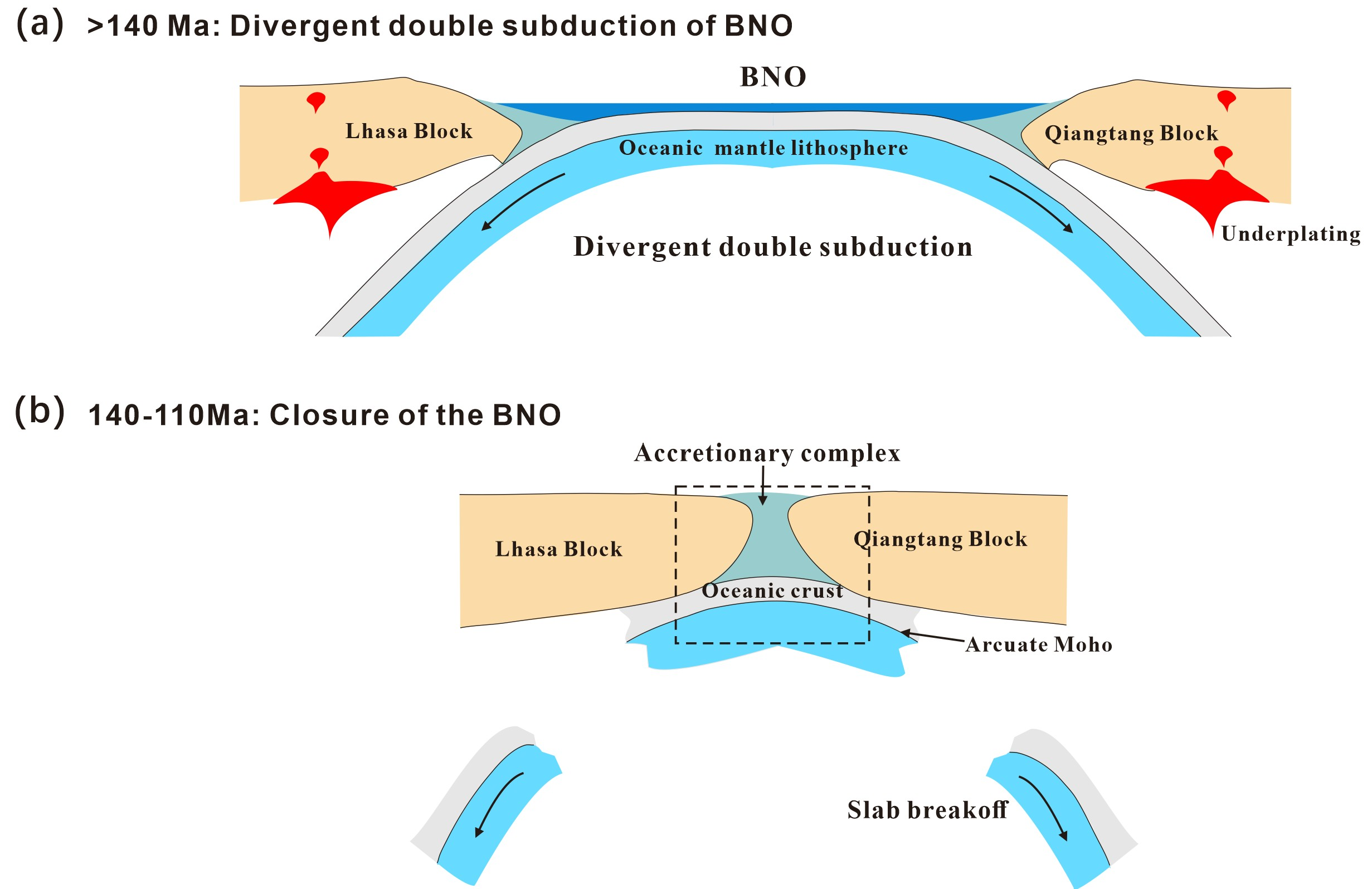 图3 班公怒江洋演化卡通图。(a)班公怒江洋(BNO)的双向俯冲;(b)拉萨与羌塘软碰撞及班公怒江洋板片断离和残留过程,矩形框标示研究区范围,拉萨块体和羌塘块体之间的物质为增生楔