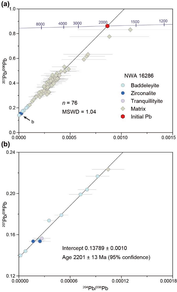 图2 NWA16286的Pb-Pb等时线。(a) 共计76个多矿物测点拟合的Pb-Pb等时线;(b) 上图等时线靠近y轴交点处放大图,突出显示含锆矿物测点数据